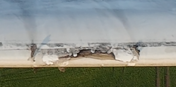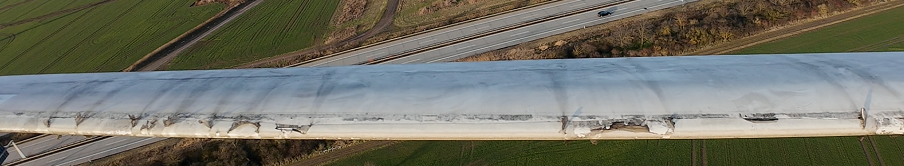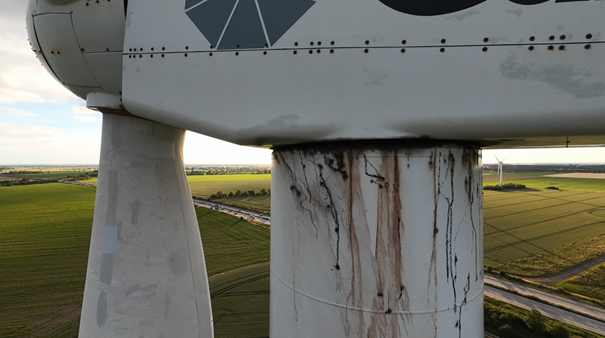 So sieht es aus, wenn Schmieröle und andere Betriebsstoffe austreten und sich auf dem Feld verteilen. Auch gut erkennbar sind die Reparaturarbeiten an den Flügelflächen: